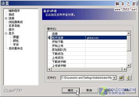 2.選擇“編輯”→“設置”,在打開的窗口中單擊“顯示”下的“聲音”項,再選擇相應的事件,然后單擊相應事件。再在窗口下方選擇相應的聲音,或者單擊“打開”按鈕選擇相應的WAV聲音即可(如圖5)。這樣當我們連接服務器、斷開連接、開始下載、出現疑問或開始上傳時就會有相應的聲音來提醒我們。