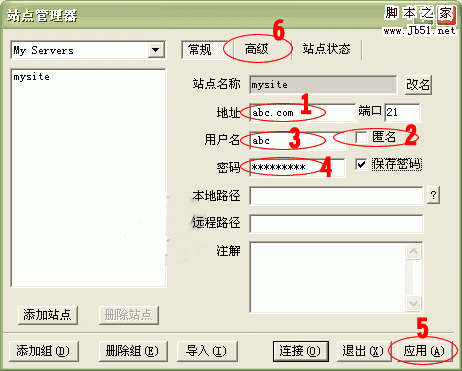 3.點擊“確定”后,出現以下界面。在1處輸入您的站點地址(如:abc.com),將2處“匿名”前的選鉤去掉,在3處輸入FTP用戶名(如:abc),在4處輸入FTP密碼(將保存密碼前的選鉤打上),點擊5處“應用”按鈕;
