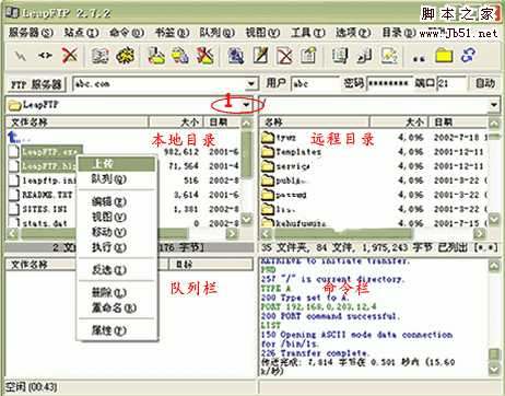 6.連接成功后的界面如下圖所示。左上框為本地目錄,您可以通過 1 處的下拉菜單選擇您要上傳文件的目錄,選擇后該目錄下的所有文件都會顯示在這個框里。 選擇您要上傳的文件,并點鼠標“右鏈”->“上傳”, 這時在隊列欄里會顯示正在上傳及未上傳的文件, 當您的文件上傳成功完成后,在命令欄里會出現“傳送完成”的提示,此時在過程目錄欄里就可以看到您上傳的文件了。