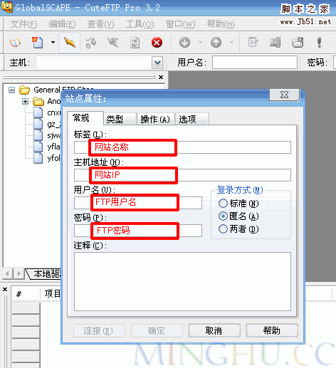 3. 填寫網(wǎng)站虛擬主機(jī)FTP登錄的資料: