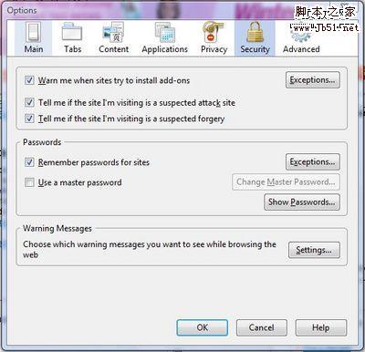 如果你點擊工具-》選項,你會打開Firefox 3的選項控制臺,在這里你可以定制很多選項。點擊頂部的安全標簽,你可以看到這里展示的窗口。