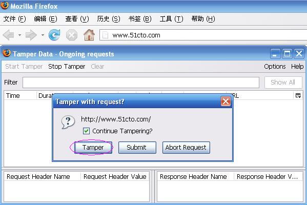 點擊 Tamper Data 主窗口上的“Start Tamper”,開啟對 HTTP 請求的截取。
