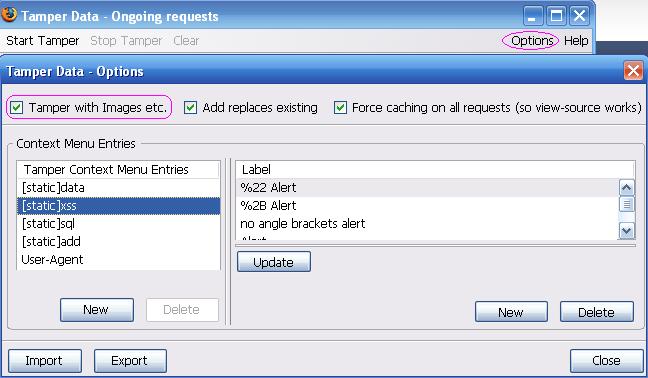 默認情況下,Tamper Data 不會截取對圖片的請求,所以,如果我們需要對獲取圖片的請求進行定制,那么需要一點點修改,點擊 Tamper Data 主窗口上的“Option”,會出現下面的窗口,勾選“Tamper with Images etc.”就可以了。