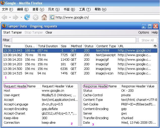 可以看出,其主窗口主要分成三部分,分別如圖中的 1,2,3 所示。當我們打開 Tamper Data 后,我們瀏覽網頁時發出的每一個 HTTP 請求及其對應的響應都會被 Tamper Data 記錄下來。第 1 部分顯示每一個 HTTP 請求及其對應的 HTTP 響應的概要信息,其中包括了大量有用的信息,比如頁面元素大小,HTTP 請求的方法,HTTP 響應的狀態值,等等。最值得注意的是“Duration”和“Total Duration”這兩個字段的值,他們顯示出了打開每一個頁面元素所花費的時間和打開該頁面花費的總時間。根據這些時間值,就可以判斷出打開我們頁面的速度如何,是哪些頁面元素影響了整個頁面打開的速度,從而為我們進一步優化頁面提供寶貴的信息。當我們在第 1 部分選中某條概要信息后,第 2 部分會顯示出對應的 HTTP 請求的頭部信息,第 3 部分會顯示出對應的 HTTP 響應的頭部信息。
