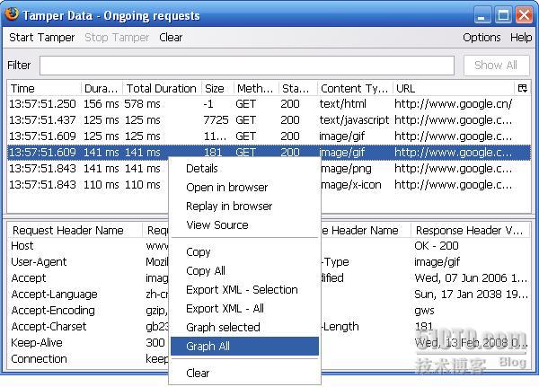 如果我們比較喜歡查看圖型化的統計信息,那么可以在 Tamper Data 主窗口的第 1 部分單擊右鍵,在彈出的菜單上點擊“Graph All”,如下圖所示,那么這些每個頁面元素及其打開它們所花費的時間,就會以圖形的方式,直觀地顯示出來。具體的圖形,就不提供了。