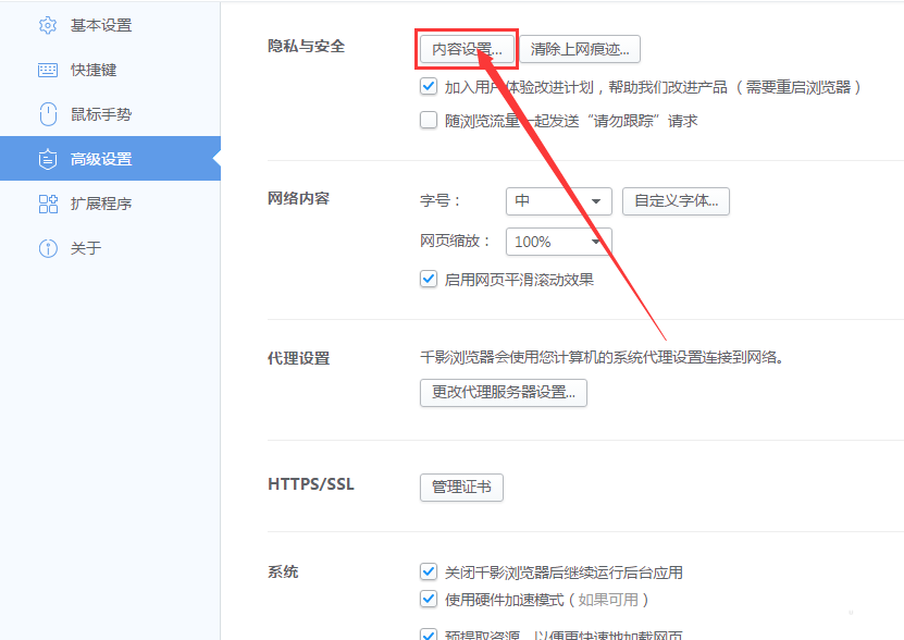 5、進入上面頁面后,找到隱私與安全-〉內容設置,如下圖所示點擊內容設置