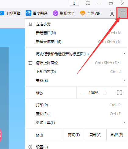 1、首先打開千影瀏覽器,找到右上角看到一個三橫杠的圖標,如下圖所示,點擊彈出下拉菜單。
