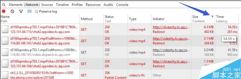 在網(wǎng)頁視頻播放的過程中,點(diǎn)擊“NetWork”選項(xiàng)卡界面中的“Size”項(xiàng)以實(shí)現(xiàn)按文件大小進(jìn)行排序顯示。由于在整個(gè)網(wǎng)頁中,視頻文件占用空間最大,因此根據(jù)“文件類型”(通常為“Video/mp4”)和“文件大小”很容易就可以找到視頻地址。