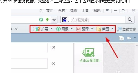 首先當然是打開360瀏覽器,先查看右上角位置,圖中區域顯示的是已安裝的插件。