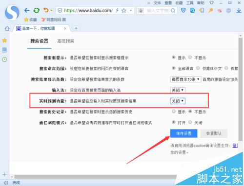 5、在“搜索設置”頁面中,將實時預測功能選項選擇為“關閉”,再點擊“保存設置”選項。如圖所示;