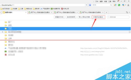 2、打開收藏-整理收藏夾,進入收藏夾管理(或ctrl+B),點擊“恢復歷史記錄”