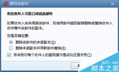 2、彈出撤回郵件窗口,可選擇刪除未讀副本或使用新郵件替換。