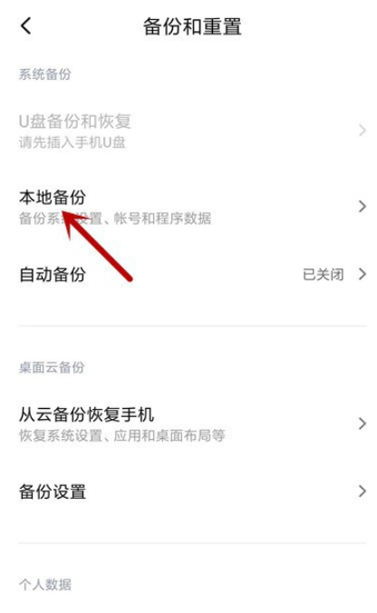 進入以下界面,找到并點擊【備份和重置】,選擇【本地備份】功能,