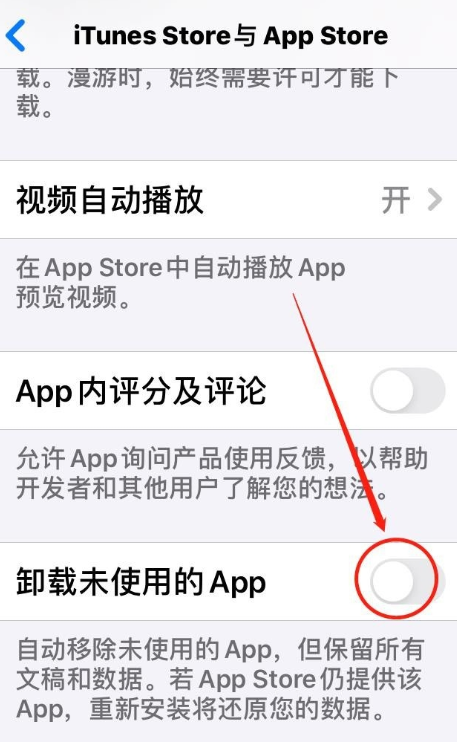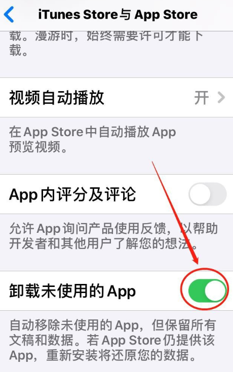 找到【卸載未使用的App】選項,這里默認關閉,現在將其開啟,iPhone即可自動移除未使用的App并保留數據。