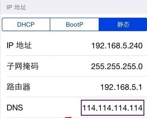 打開蘋果手機(jī)上的設(shè)置,點擊“無線局域網(wǎng)”,點擊已連接的wifi網(wǎng)絡(luò),進(jìn)入后點擊“靜態(tài)”,輸入路由器的IP地址范圍、子網(wǎng)掩碼、網(wǎng)關(guān),將DNS修改為8.8.8.8或114.114.114.144。