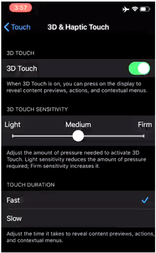 3D Touch設置頁面更名為3D & Haptic Touch,還出現了一個“Touch Duration”(觸摸持續時間)的選項,該功能可以調整在內容預覽、選擇命令和瀏覽菜單時觸控功能的震動速度。