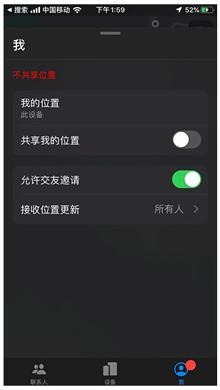 2、查找App增加“我”標簽頁,iOS 13中,查找App圖標設計有了較大變化,屏幕底部多了一個“我”選項,其中會顯示這臺設備的位置以及是否共享位置信息的開關。