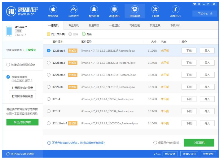 在可刷版本中選擇您要刷的iOS版本,點“立即刷機”,愛思助手會自動下載固件并刷機;