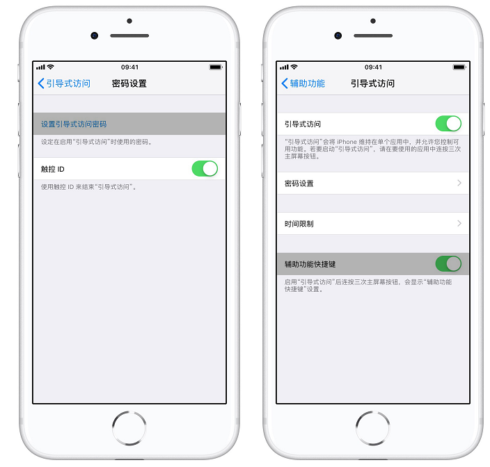 可以在「密碼設置」界面為「引導式訪問」設置密碼(支持觸控ID面容ID解鎖);并打開「輔助功能快捷鍵」;