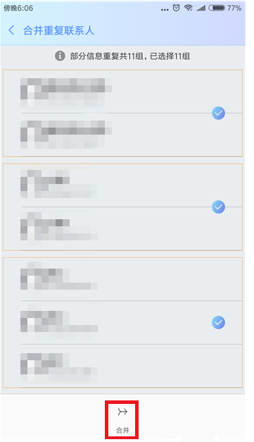 接下來手機會自動識別手機中的重復聯系人,識別好后可以進行選擇,接著點擊底部的【合并】即可完成合并重復聯系人。