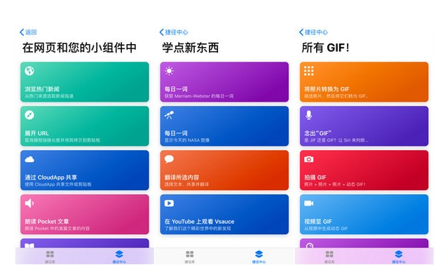 「捷徑庫」里面保存了已有的捷徑。「捷徑中心」則可以下載現存的捷徑(包括官方分享和他人分享的),這里有多個分類,你可以根據分類去尋找自己需要的捷徑。