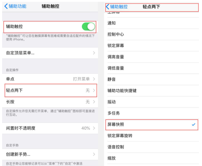 找到【輔助觸控】并打開,找到并選擇【輕點兩下】,然后勾選屏幕快照即可。