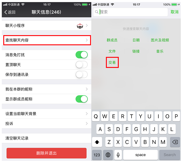 3、選擇「查找聊天內(nèi)容」,點擊「交易」,