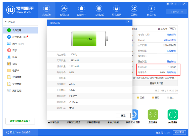 打開愛思助手PC端,將iPhone手機連接到電腦,在【我的設備】中,有電池壽命的顯示,你還可以點擊后面的【電池詳情】進一步查看。