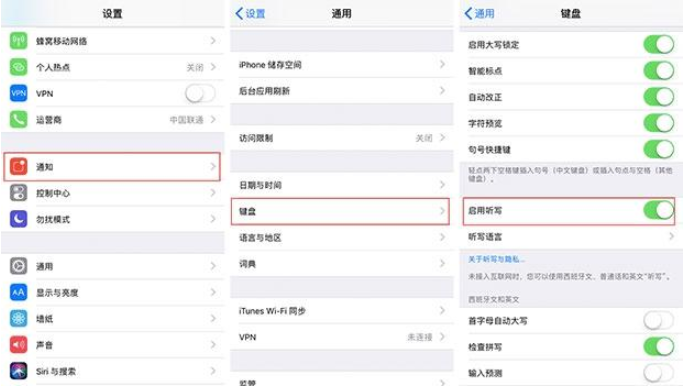 以iOS 11.4為例,依次打開系統「設置」、「通知」、「鍵盤」,找到「啟用聽寫」選項,將其關閉即可。
