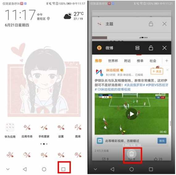 后臺(tái)應(yīng)用打開(kāi)過(guò)多,這時(shí)就可以點(diǎn)擊虛擬導(dǎo)航欄方塊鍵,然后依次刪除后臺(tái)應(yīng)用或者點(diǎn)擊下面的垃圾桶圖標(biāo),一次性刪除后臺(tái)應(yīng)用。