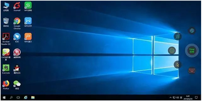 我們可以看到,這臺電腦桌面上已經(jīng)預裝了WPS、印象筆記、火狐瀏覽器、Foxmail、微信、QQ等常用軟件,這個界面會呈現(xiàn)在手機上,如果使用了投屏,就會呈現(xiàn)在屏幕上。和常見的Windows桌面相比,就是右邊多了一個懸浮球按鈕。
