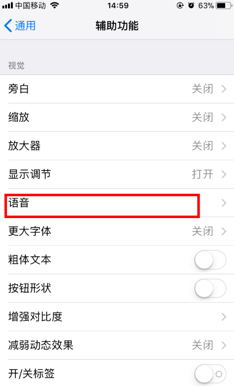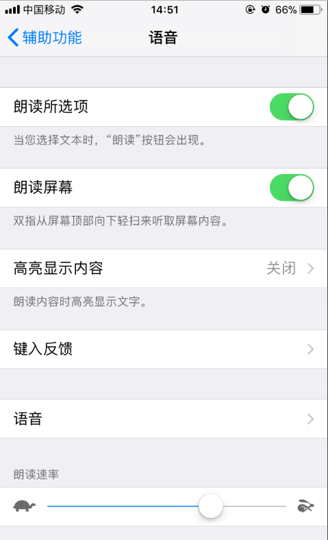 然后再進(jìn)入語音,打開兩個(gè)功能:朗讀屏幕、朗讀所選項(xiàng)即可。