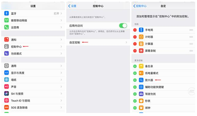 同樣打開設置,點擊“控制中心”,再點擊“自定控制”,你就可以在下一欄中看到放大器了,點擊“放大器”前的+號。