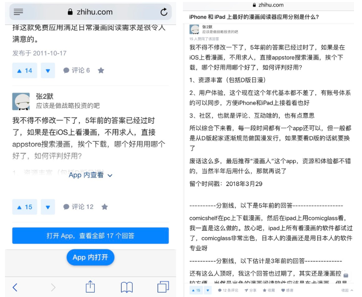 以知乎為例,移動版中除第一條以外,其他回答都被折疊了,附上一段“App內(nèi)查看”的提示。沒事,請求一下桌面版試試(在Safari可以長按地址欄右側(cè)刷新按鈕),就能看到那些被折疊的內(nèi)容了: