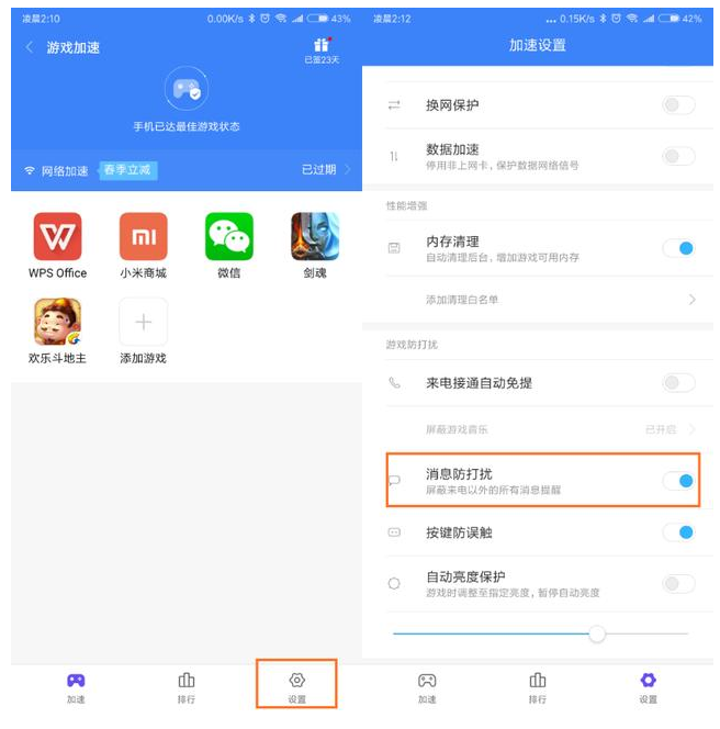 把指定APP添加到游戲,使其具有游戲標簽只是解鎖“來電懸浮”的必要條件,而要想實現來電懸浮,還得開啟“消息防打擾”。在游戲加速器首頁,點擊右下角設置的按鈕進入設置,找到“消息防打擾”并開啟,這樣就可以實現非靜音時,指定APP實現“來電懸浮通知”。
