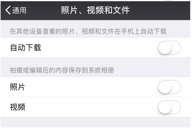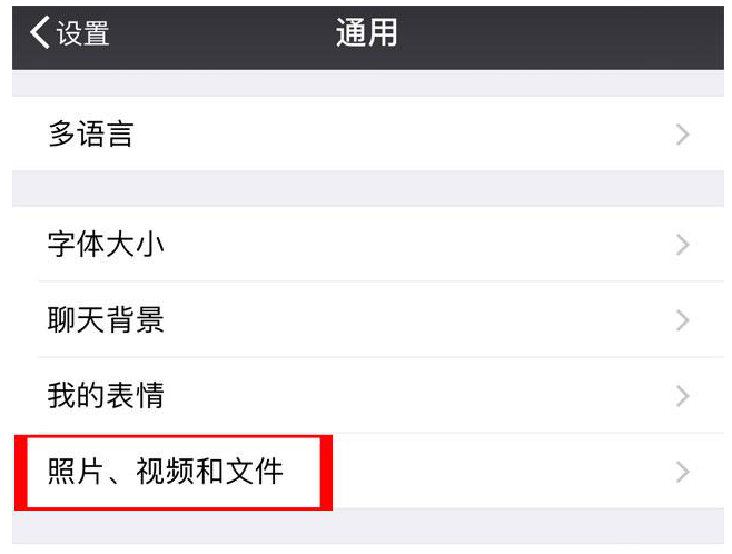 第二個(gè),打開(kāi)微信設(shè)置,在通用里找到“照片、視頻和文件,關(guān)閉自動(dòng)下載,因?yàn)槲覀兤綍r(shí)跟親朋好友的聊天信息,看到的照片或者視頻和文件,都會(huì)保存到你的相冊(cè)里。