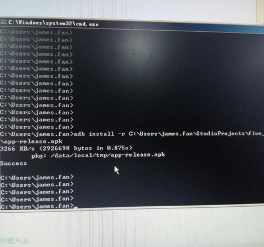 5、在cmd中輸入adb install -r 后,將apk直接拖到到cmd界面光標處,點擊回車,如下圖所示。