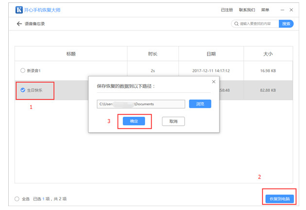 3、軟件掃描數據完成后,可以看到iPhone 7設備中的錄音數據。如果數據過多,可以通過右上角的【搜索】查找需要的內容,然后勾選我們需要導出的數據,點擊【恢復到電腦】,選擇保存的路徑即可;