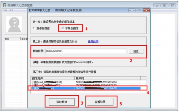 7,下載并打開(kāi)“微信聊天記錄恢復(fù)器”軟件,該軟件又名為“樓月微信聊天記錄導(dǎo)出恢復(fù)助手”,該軟件為免安裝的綠色軟件,下載后將其打開(kāi),按下圖進(jìn)行設(shè)置,其中微信版本要設(shè)置為“蘋(píng)果版微信”,數(shù)據(jù)目錄要設(shè)置為前面導(dǎo)出的Documents文件夾,設(shè)置好后點(diǎn)擊3處的讀取數(shù)據(jù)按鈕,然后軟件會(huì)對(duì)Documents里面的所有文件進(jìn)行分析,并提取出里面曾經(jīng)登陸過(guò)的微信號(hào)顯示在軟件界面上,我們選擇一個(gè)想恢復(fù)微信聊天記錄的微信號(hào)后,點(diǎn)擊5處的“查看記錄”按鈕即可。