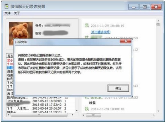 蘋(píng)果微信聊天記錄刪除了怎么恢復(fù)?iphone微信聊天記錄刪除了怎么恢復(fù)呢?下面小編推薦的這個(gè)“微信聊天記錄恢復(fù)器”軟件能夠恢復(fù)自己蘋(píng)果手機(jī)上不小心刪除的微信聊天記錄,軟件在底層對(duì)保存微信聊天記錄的數(shù)據(jù)庫(kù)文件進(jìn)行提取并恢復(fù),小編在對(duì)自己的蘋(píng)果手機(jī)進(jìn)行恢復(fù)后,成功找回了一千多條聊天記錄,甚至包括幾年前刪除的一些聊天內(nèi)容,恢復(fù)后界面如下所示: