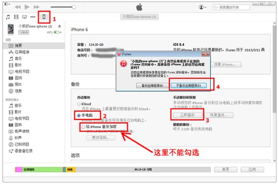 2、在電腦上安裝并打開(kāi)iTunes軟件,點(diǎn)擊iTunes窗口左上角的iPhone小圖標(biāo),然后選擇“本電腦”并點(diǎn)擊“立即備份”按鈕。如果彈出窗口詢(xún)問(wèn)是否備份應(yīng)用程序的話(huà),請(qǐng)點(diǎn)擊“不備份應(yīng)用程序”,如果還彈出窗口詢(xún)問(wèn)是否對(duì)備份數(shù)據(jù)加密的話(huà),請(qǐng)點(diǎn)擊“不加密”。