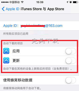 在【iCloud】界面上下滑就可以找到【iTunes Store與App Store】,在這里即可關閉應用的同步和自動更新。