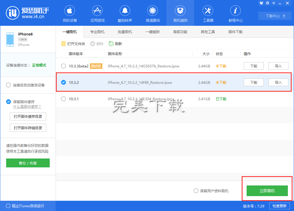 2、在可刷版本中選擇您要刷的iOS版本,點“立即刷機”,之后愛思助手會自動幫您下載固件并刷機;如果您已下載固件可以點擊“導入”,再點“立即刷機”;