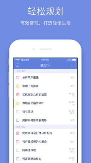 不管是生活瑣事還是工作安排,滴答清單都可以進(jìn)行管理。你還可以利用滴答清單制定學(xué)習(xí)、工作計劃,制作購物、旅行、讀書、裝修清單,設(shè)置生日、約會、信用卡還款等提醒,或者用來進(jìn)行簡單的項目管理,并可與同事、家人、朋友共享清單進(jìn)行各種協(xié)同工作。