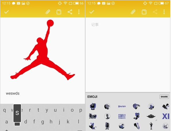 耐克對這款喬丹輸入法的定位就是,讓你輸入各種Air Jordan相關的圖案,以及Air Jordan鞋子的圖片,還是與耐克平品牌息息相關的,它提供了Air Jordan圖案和喬丹鞋的EMOJI。此外,用它來輸入這些表情,似乎也不是即按即得,點擊某個表情后,需要通過安卓系統的分享接口,才能把表情粘貼到某個App的輸入窗口中。不知道其他使用者是否也這樣!