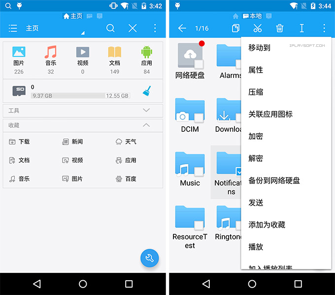 ES文件管理器的功能也有很多:比如局域網共享、遠程網絡文件管理、網盤管理、磁盤分析、基本的文件操作、加密、壓縮/解壓、多媒體瀏覽、文件搜索、流媒體播放、藍牙支持、應用管理等等,更多功能等你操作體驗。