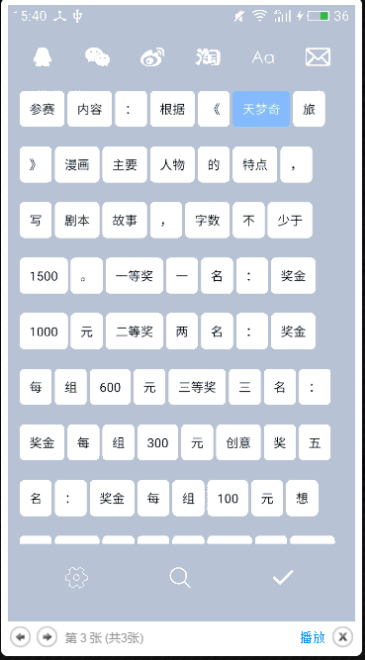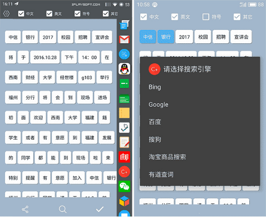 此外,界面的右邊還會列出一些 APP 圖標,當你在分詞界面選擇一些字詞之后,就能將它們拖放到這些應用中去,比如發微信、QQ、微博、短信等等。這就是仿One Step 功能,用起來體驗不錯很方便。