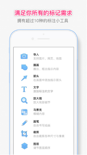 iMark的操作很簡單,只要你會玩手機(jī)就會操作iMark,在操作過程中,每增加一個標(biāo)記、每一個線框、文字,每一個箭頭通通都會增加一個新圖層,你可以在歷史記錄里撤銷/重做操作,調(diào)整圖層的順序、移動某個標(biāo)記的位置,或者刪除某個圖層,非常方便。