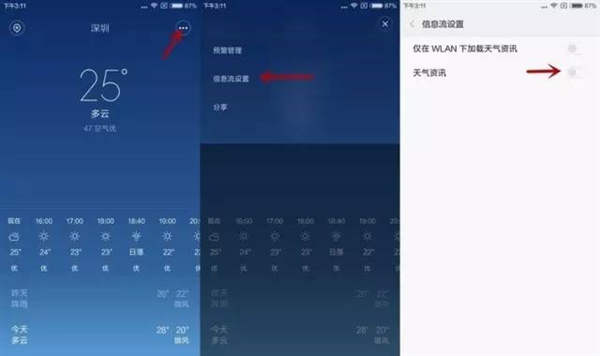 天氣預報下的各種咨詢,可以點擊右上角“…”,選擇【信息流設置】,按需要關閉【天氣咨詢】即可