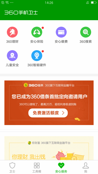 360借條目前采用用戶邀請制,入口逐步開放中,收到邀請的用戶可在360手機衛士中開通360借條。